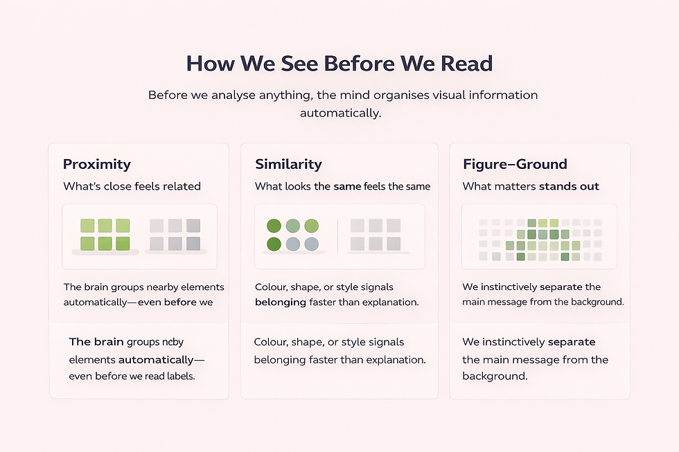 They describe how the human brain automatically organises visual information — grouping, separating, and prioritising — not because we’re analytical, but because that’s how perception works.
